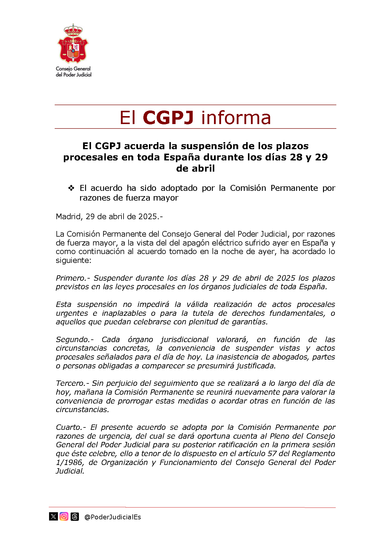 En el segundo acuerdo, que se dicta «por razones de fuerza mayor, a la vista del apagón eléctrico sufrido ayer en España», ordena el Consejo «Suspender durante los días 28 y 29 de abril de 2025 los plazos previstos en las leyes procesales en los órganos judiciales de toda España.» No obstante, ello no impide realizar válidamente los actos procesales urgentes e inaplazables, o los necesarios para la tutela de los derechos fundamentales, o los que puedan celebrarse con plenitud de garantías.